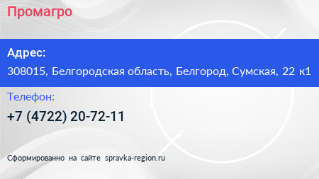 Промагро по адресу 308015, Белгородская область, Белгород, Сумская, 22 к1 в дальнейшем Организация, размещена в следующих категориях: