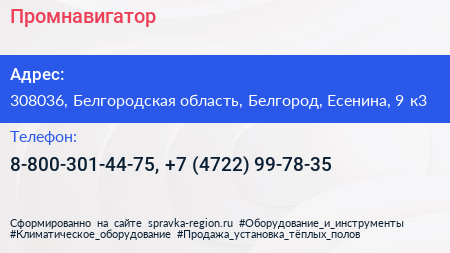 Промнавигатор по адресу 308036, Белгородская область, Белгород, Есенина, 9 к3 в дальнейшем Организация, размещена в следующих категориях: