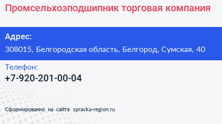 Промсельхозподшипник, торговая компания по адресу 308015, Белгородская область, Белгород, Сумская, 40 в дальнейшем Организация, размещена в следующих категориях: