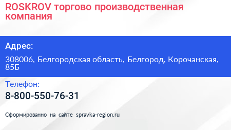 ROSKROV, торгово-производственная компания по адресу 308006, Белгородская область, Белгород, Корочанская, 85Б в дальнейшем Организация, размещена в следующих категориях: