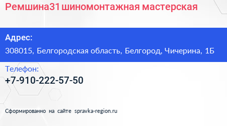 Ремшина31, шиномонтажная мастерская по адресу 308015, Белгородская область, Белгород, Чичерина, 1Б в дальнейшем Организация, размещена в следующих категориях:
