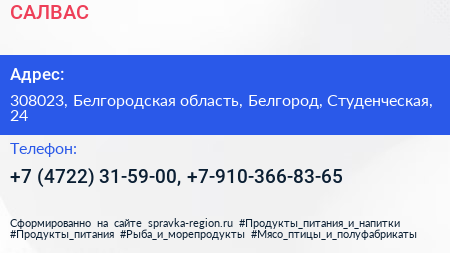 САЛВАС по адресу 308023, Белгородская область, Белгород, Студенческая, 24 в дальнейшем Организация, размещена в следующих категориях: