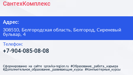 СантехКомплекс по адресу 308510, Белгородская область, Белгород, Сиреневый бульвар, 4 в дальнейшем Организация, размещена в следующих категориях: