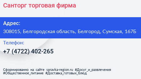 Санторг, торговая фирма по адресу 308015, Белгородская область, Белгород, Сумская, 167Б в дальнейшем Организация, размещена в следующих категориях: