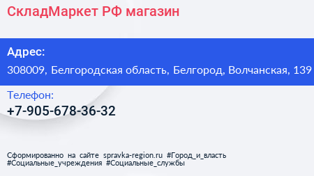СкладМаркет.РФ, магазин по адресу 308009, Белгородская область, Белгород, Волчанская, 139 в дальнейшем Организация, размещена в следующих категориях: