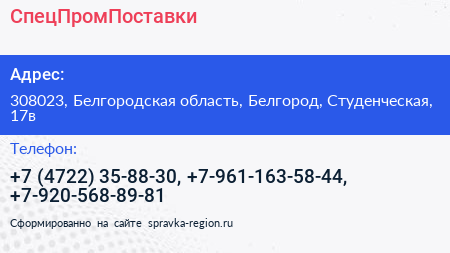 СпецПромПоставки по адресу 308023, Белгородская область, Белгород, Студенческая, 17в в дальнейшем Организация, размещена в следующих категориях: