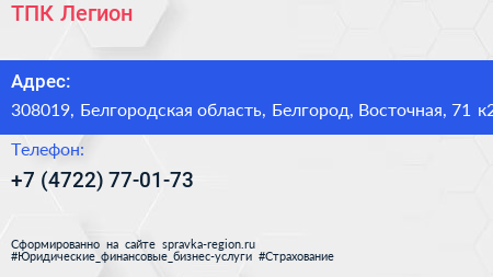 ТПК Легион по адресу 308019, Белгородская область, Белгород, Восточная, 71 к2 в дальнейшем Организация, размещена в следующих категориях: