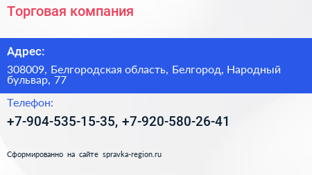 Торговая компания по адресу 308009, Белгородская область, Белгород, Народный бульвар, 77 в дальнейшем Организация, размещена в следующих категориях: