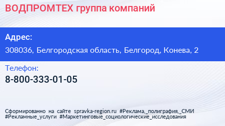 ВОДПРОМТЕХ, группа компаний по адресу 308036, Белгородская область, Белгород, Конева, 2 в дальнейшем Организация, размещена в следующих категориях:
