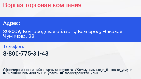 Воргаз, торговая компания по адресу 308009, Белгородская область, Белгород, Николая Чумичова, 38 в дальнейшем Организация, размещена в следующих категориях: