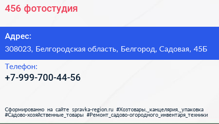 456, фотостудия по адресу 308023, Белгородская область, Белгород, Садовая, 45Б в дальнейшем Организация, размещена в следующих категориях: