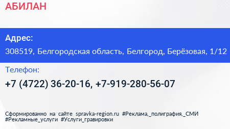 АБИЛАН по адресу 308519, Белгородская область, Белгород, Берёзовая, 1/12 в дальнейшем Организация, размещена в следующих категориях: