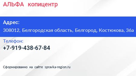 АЛЬФА+, копицентр по адресу 308012, Белгородская область, Белгород, Костюкова, 36а в дальнейшем Организация, размещена в следующих категориях: