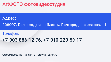 ArtФОТО, фотовидеостудия по адресу 308007, Белгородская область, Белгород, Некрасова, 11 в дальнейшем Организация, размещена в следующих категориях:
