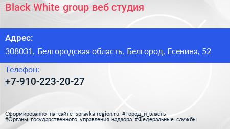 Black & White group, веб-студия по адресу 308031, Белгородская область, Белгород, Есенина, 52 в дальнейшем Организация, размещена в следующих категориях: