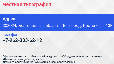 Честная типография по адресу 308024, Белгородская область, Белгород, Костюкова, 13Б в дальнейшем Организация, размещена в следующих категориях: