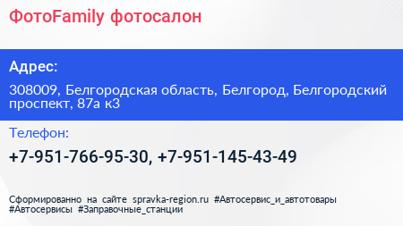 ФотоFamily, фотосалон по адресу 308009, Белгородская область, Белгород, Белгородский проспект, 87а к3 в дальнейшем Организация, размещена в следующих категориях: