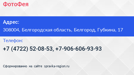 ФотоФея по адресу 308004, Белгородская область, Белгород, Губкина, 17 в дальнейшем Организация, размещена в следующих категориях: