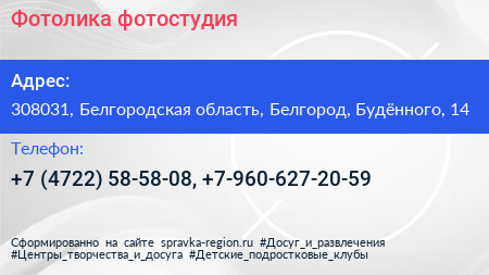 Фотолика, фотостудия по адресу 308031, Белгородская область, Белгород, Будённого, 14 в дальнейшем Организация, размещена в следующих категориях: