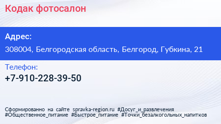 Кодак, фотосалон по адресу 308004, Белгородская область, Белгород, Губкина, 21 в дальнейшем Организация, размещена в следующих категориях: