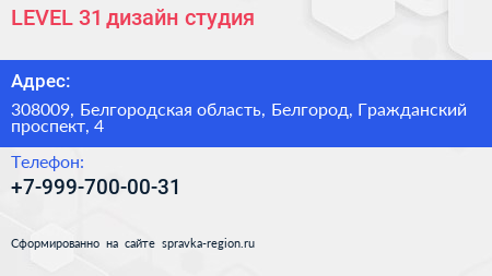 LEVEL 31, дизайн-студия по адресу 308009, Белгородская область, Белгород, Гражданский проспект, 4 в дальнейшем Организация, размещена в следующих категориях: