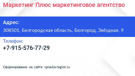 Маркетинг Плюс, маркетинговое агентство по адресу 308501, Белгородская область, Белгород, Звёздная, 9 в дальнейшем Организация, размещена в следующих категориях: