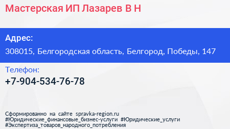 Мастерская, ИП Лазарев В.Н. по адресу 308015, Белгородская область, Белгород, Победы, 147 в дальнейшем Организация, размещена в следующих категориях: