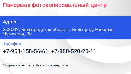 Панорама, фотокопировальный центр по адресу 308009, Белгородская область, Белгород, Николая Чумичова, 38 в дальнейшем Организация, размещена в следующих категориях: