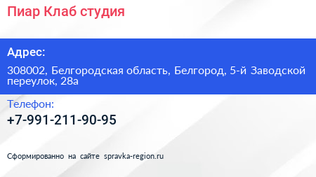 Пиар Клаб, студия по адресу 308002, Белгородская область, Белгород, 5-й Заводской переулок, 28а в дальнейшем Организация, размещена в следующих категориях:
