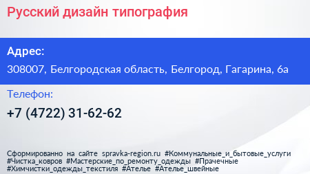 Русский дизайн, типография по адресу 308007, Белгородская область, Белгород, Гагарина, 6а в дальнейшем Организация, размещена в следующих категориях: