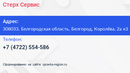Стерх Сервис по адресу 308033, Белгородская область, Белгород, Королёва, 2а к3 в дальнейшем Организация, размещена в следующих категориях: