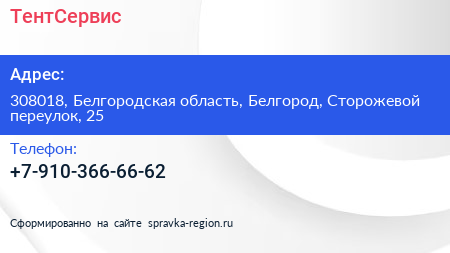 ТентСервис по адресу 308018, Белгородская область, Белгород, Сторожевой переулок, 25 в дальнейшем Организация, размещена в следующих категориях: