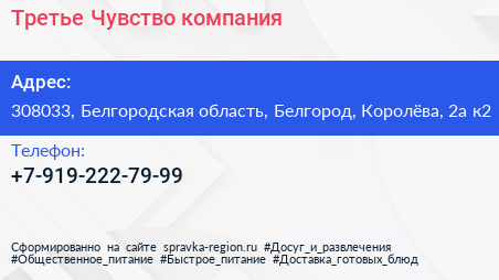Третье Чувство, компания по адресу 308033, Белгородская область, Белгород, Королёва, 2а к2 в дальнейшем Организация, размещена в следующих категориях: