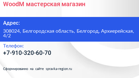 WoodM, мастерская-магазин по адресу 308024, Белгородская область, Белгород, Архиерейская, 4/2 в дальнейшем Организация, размещена в следующих категориях: