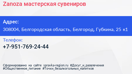 Zanoza, мастерская сувениров по адресу 308004, Белгородская область, Белгород, Губкина, 25 к1 в дальнейшем Организация, размещена в следующих категориях: