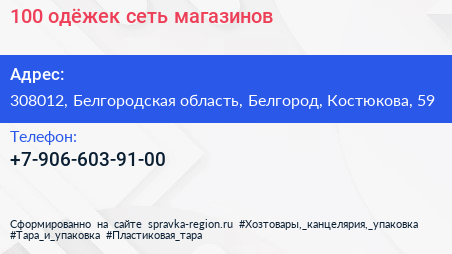 100 одёжек, сеть магазинов по адресу 308012, Белгородская область, Белгород, Костюкова, 59 в дальнейшем Организация, размещена в следующих категориях: