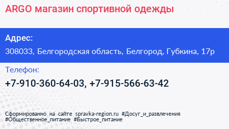 ARGO, магазин спортивной одежды по адресу 308033, Белгородская область, Белгород, Губкина, 17р в дальнейшем Организация, размещена в следующих категориях: