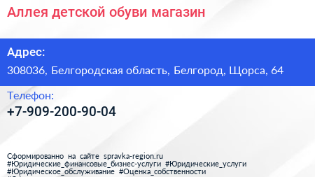 Аллея детской обуви, магазин по адресу 308036, Белгородская область, Белгород, Щорса, 64 в дальнейшем Организация, размещена в следующих категориях: