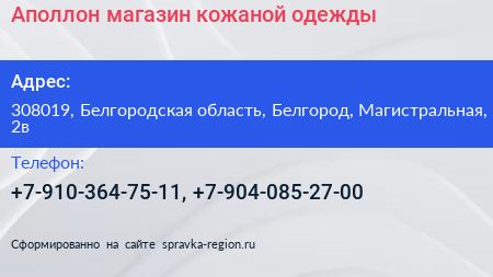 Аполлон, магазин кожаной одежды по адресу 308019, Белгородская область, Белгород, Магистральная, 2в в дальнейшем Организация, размещена в следующих категориях: