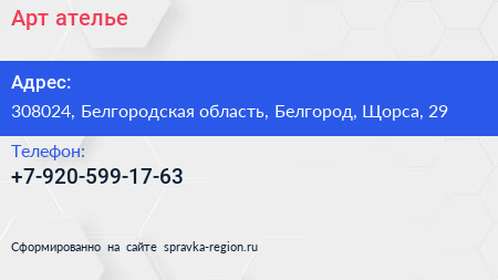 Арт-ателье по адресу 308024, Белгородская область, Белгород, Щорса, 29 в дальнейшем Организация, размещена в следующих категориях: