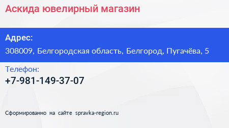 Аскида, ювелирный магазин по адресу 308009, Белгородская область, Белгород, Пугачёва, 5 в дальнейшем Организация, размещена в следующих категориях: