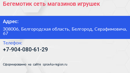 Бегемотик, сеть магазинов игрушек по адресу 308006, Белгородская область, Белгород, Серафимовича, 67 в дальнейшем Организация, размещена в следующих категориях: