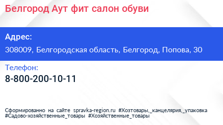 Белгород Аут фит, салон обуви по адресу 308009, Белгородская область, Белгород, Попова, 30 в дальнейшем Организация, размещена в следующих категориях: