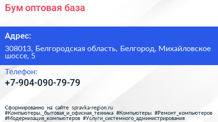 Бум, оптовая база по адресу 308013, Белгородская область, Белгород, Михайловское шоссе, 5 в дальнейшем Организация, размещена в следующих категориях:
