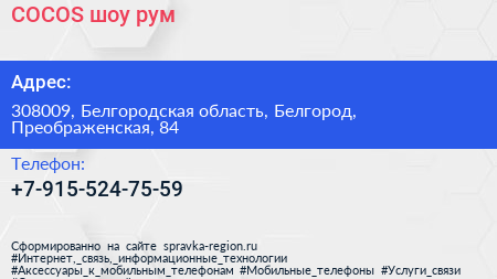 COCOS, шоу-рум по адресу 308009, Белгородская область, Белгород, Преображенская, 84 в дальнейшем Организация, размещена в следующих категориях: