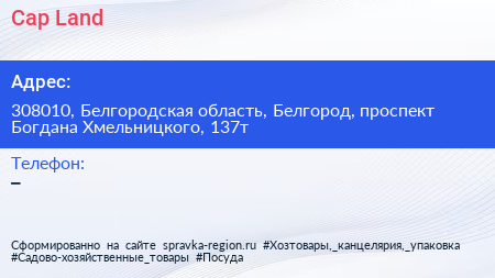 Cap Land по адресу 308010, Белгородская область, Белгород, проспект Богдана Хмельницкого, 137т в дальнейшем Организация, размещена в следующих категориях: