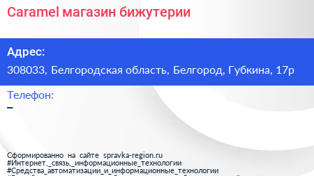 Caramel, магазин бижутерии по адресу 308033, Белгородская область, Белгород, Губкина, 17р в дальнейшем Организация, размещена в следующих категориях: