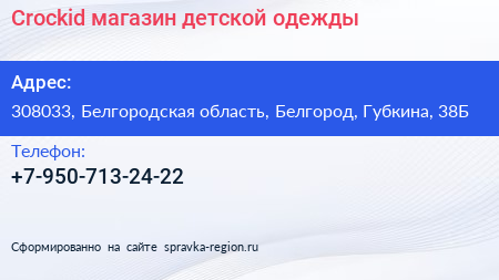 Crockid, магазин детской одежды по адресу 308033, Белгородская область, Белгород, Губкина, 38Б в дальнейшем Организация, размещена в следующих категориях: