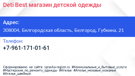 Deti.Best, магазин детской одежды по адресу 308004, Белгородская область, Белгород, Губкина, 21 в дальнейшем Организация, размещена в следующих категориях: