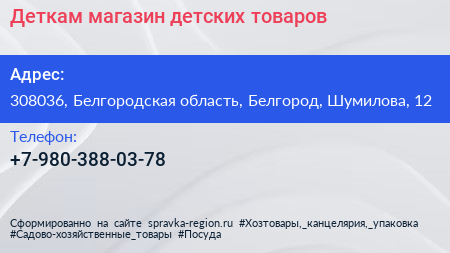 Деткам, магазин детских товаров по адресу 308036, Белгородская область, Белгород, Шумилова, 12 в дальнейшем Организация, размещена в следующих категориях: